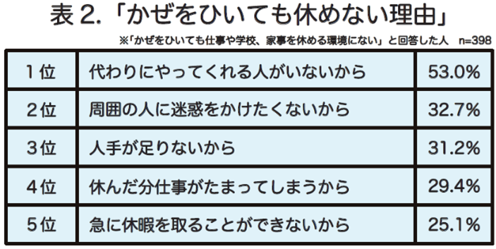 休めない理由には「代わりにやってくれる人がいないから(53.0%)」、「人手が足りないから(31.2%)」といった人員面の理由や「急に休暇を取ることができないから(25.1%)」、「休んだ分収入が減るから(19.1%)」などの休暇取得制度や収入保障などのハード面に関する理由が挙がりました。また、「周囲の人に迷惑をかけたくないから(32.7%)」、「職場の雰囲気が「かぜ程度では休まない」という空気感であるため(16.6%)」という周囲を考慮した回答も多く見られました。