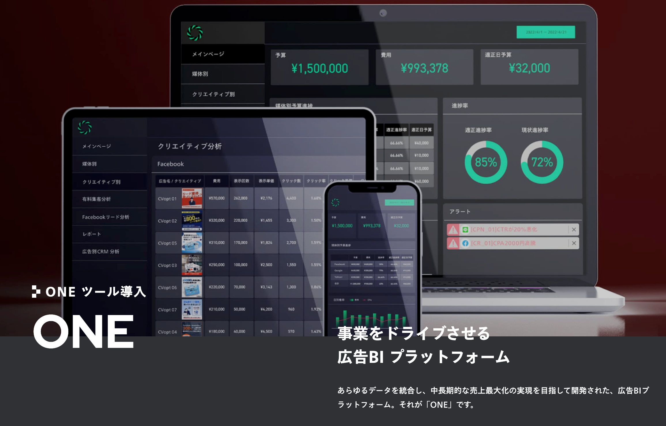 多様な広告媒体の運用データとアクセス解析データ、SFA/CRMデータを統合し、LTVや最終CVなどに最適化させた広告運用を実現する広告BIプラットフォーム「ONE」の開発運用。細かなヒアリングを元にワンストップで実施する、静止画・動画クリエイティブの企画・提案・制作。お客様の成果に必要なあらゆるサポートを一気通貫で実行しております。
