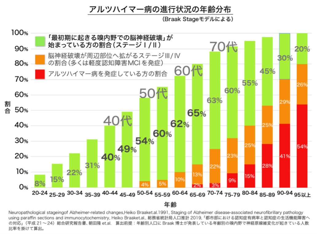 驚くことにアルツハイマー病の「最初期」段階である嗅内野での脳神経細胞の破壊が始まっている方 (Braak Stage I) は40代でも約50%近くいます。しかし自覚症状が全くない上に、既存の検査方法では「健常者」と判定されるために、知らない内にそのまま進行しているのが現状です。発症リスク低減活動 (予防活動) も最初期から始めると高い効果が期待できることが世界中で実施された疫学的研究からも分かっています。 (画像3)