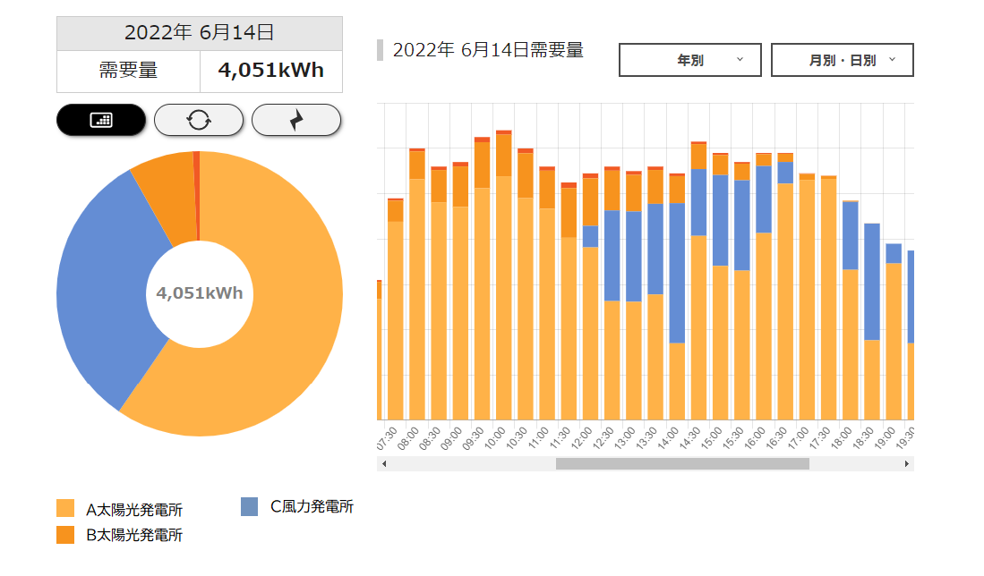 発電所を指定した電力購入は、当社のブロックチェーン技術を活用した P2P 電力トラッキングシステム「ENECTION2.0」によって実現します。発電量と需要量を30 分ごとに取引として約定し、約定結果をブロックチェーン上に書き込むことで、「どの電源からどれだけ電気を買ったか」を改ざん不可能な状態で証明します。