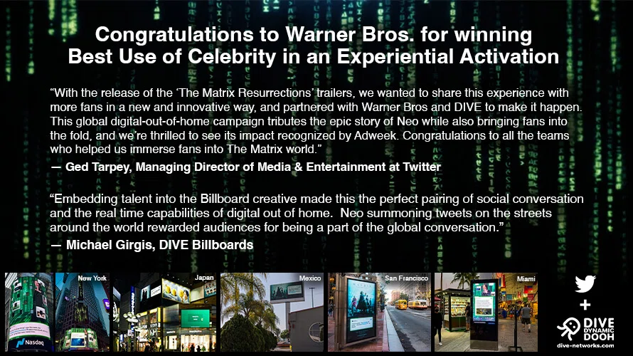 タイトル:The Matrix Resurrections 内容:Twitter × OOHの活用。ファンのツイートをOOHにて表示するキャンペーンを実施。ニューヨークのタイムズスクエアならびに、世界各国(米国・メキシコ・日本など)で配信されました。これらのツイートはタイムリーに更新されるため、取り上げられることを期待したファンや視聴者への動機づけとなりました。 |