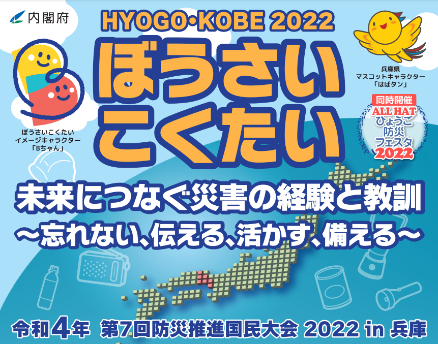防災活動の現状を発信し、その知恵を共有することを通じて、国民の防災意識向上を目指すイベント「第7回防災推進国民大会(ぼうさいこくたい2022)」を兵庫県神戸市で開催します。現地開催とオンライン配信あわせて319の団体が出展する今回は、過去最大規模での実施となります。