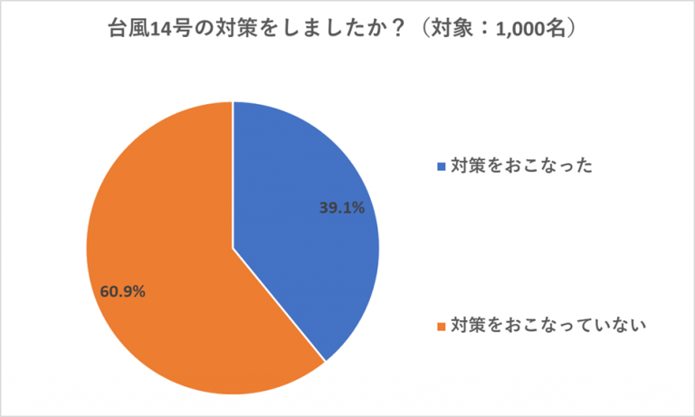 「台風14号の対策をしましたか?」の質問に対して、「対策をおこなった」と回答した人は39.1%で、約4割の人が台風14号の対策を行っていたようです。