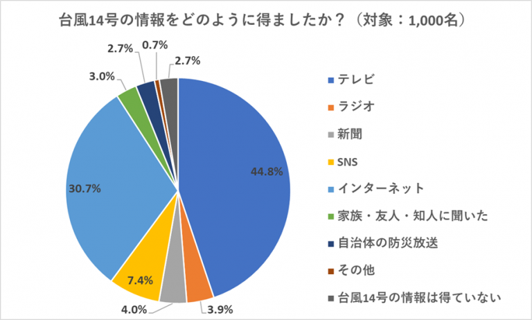 台風14号の情報源については、「テレビ」という回答が最も多く44.8%、次いで「インターネット」が30.7%という結果になりました。