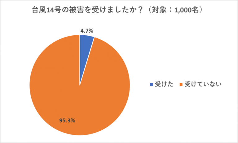台風14号の被害を「受けた」と答えた人は4.7%でした。ほとんどの人に影響は無かったようですが、モニター会員の中にも被害に合った方もいらっしゃったようですね。