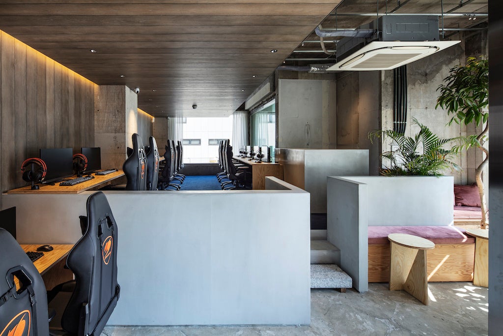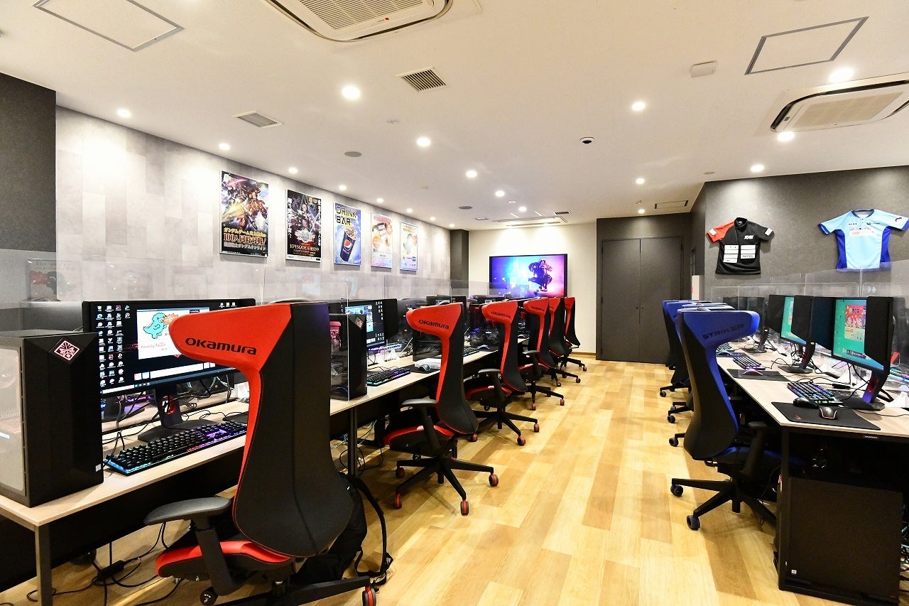 設備:パソコンエリア ゲーミングパソコンを20台設置し、ゲーミングモニタは「ZOWIE」の現行フラッグシップモデル「XL2546K」を、ゲーミングチェアは前傾姿勢を搭載した高機能な「STRIKER SEATING EX」、ヘッドセット、キーボード、マウス等の周辺機器は「HyperX」製品を全席に設置。イベント&コミュニティエリア12席