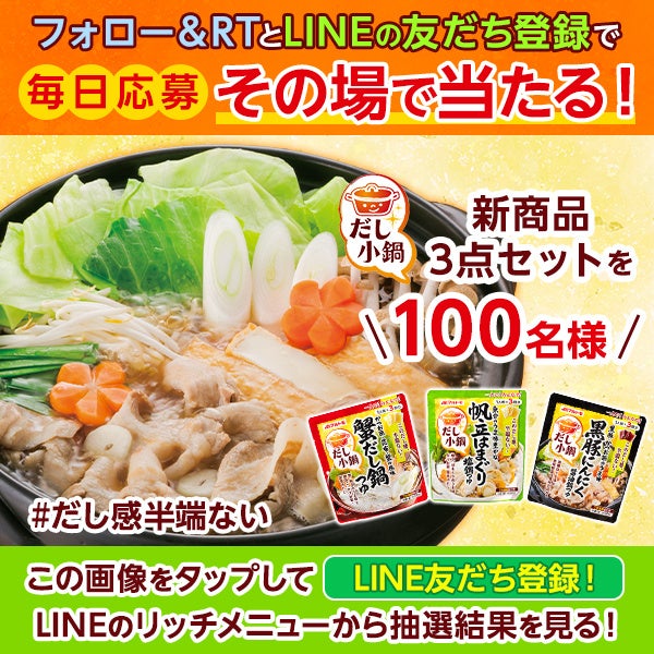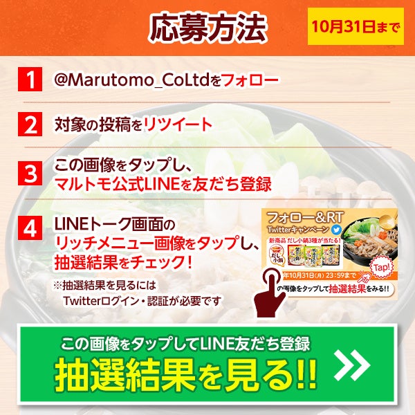 本キャンペーンはマルトモ公式Twitterのアカウントをフォローし、対象のツイートをリツイートすることで、どなたでも、毎日ご応募可能です。抽選結果は、マルトモ公式LINEアカウントを友達登録いただき、LINEトーク画面のリッチメニュー画像をタップ頂きますとご確認いただけます。肌寒くなってきた今日この頃、あたたかいお鍋で野菜やお肉・お魚をおいしく食べるなら、ぜひ「だし小鍋」シリーズをご活用ください。