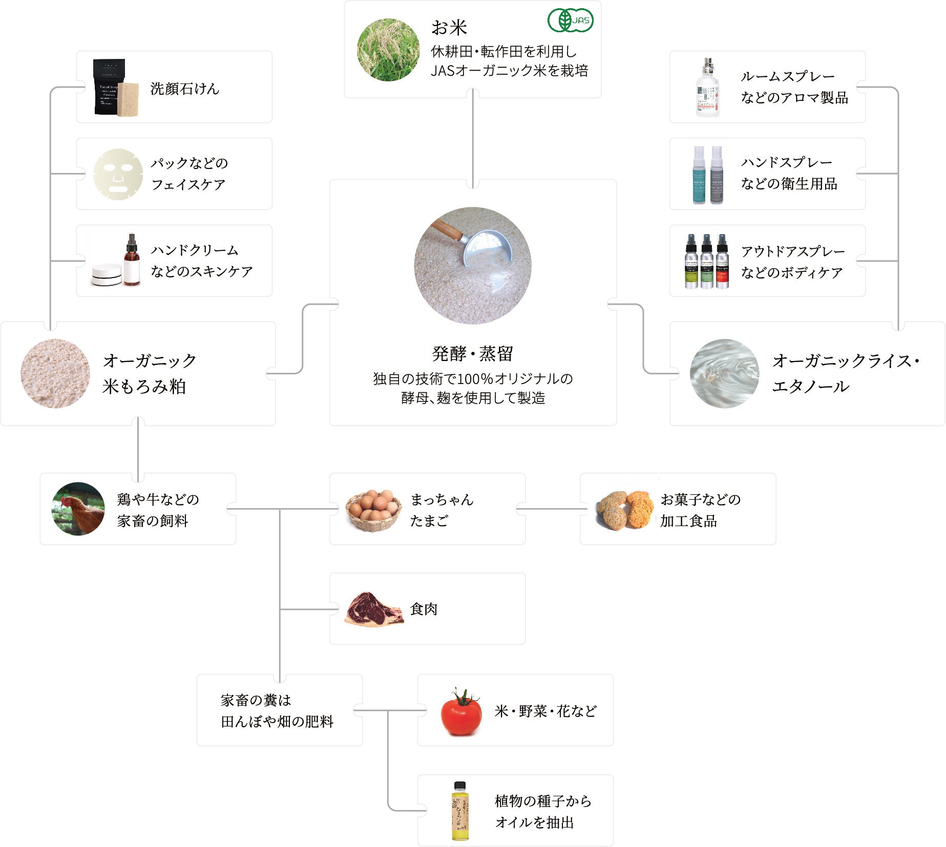エタノールの製造過程で生成される発酵粕は、化粧品原料や地域の鶏や牛の飼料として利用し、さらに鶏糞は水田や畑の肥料にするなど、廃棄物ゼロの循環型モデルを構築し、地域循環型社会の形成にも取り組んでおります。