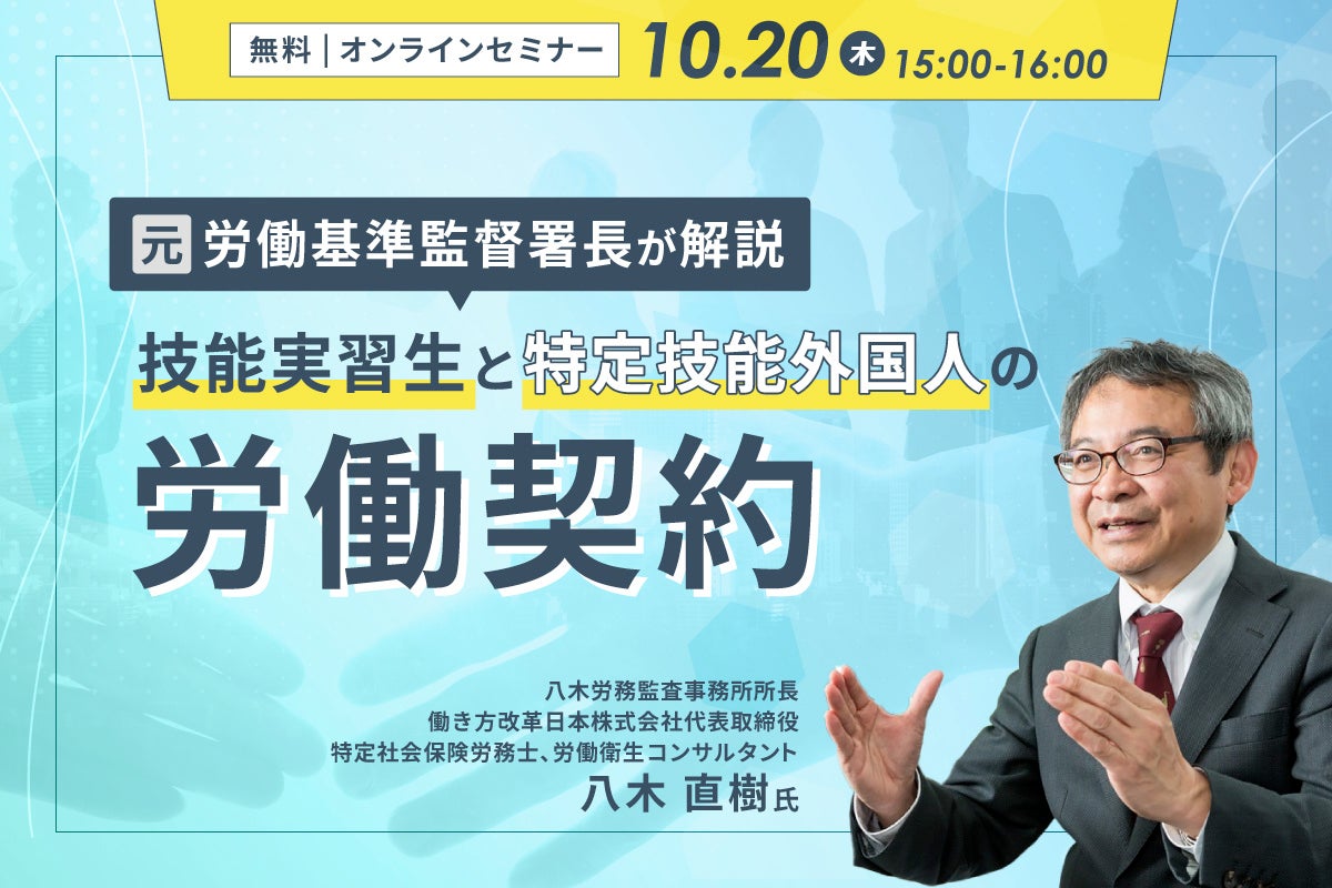 本セミナーでは、労働基準監督署長の経験を持つ八木 直樹氏をお招きし、技能実習生と特定技能外国人の労働契約について解説します。