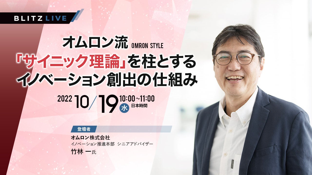 TECHBLITZ主催のオンライントークセッション「BLITZ LIVE」。今回はオムロン株式会社 イノベーション推進本部 シニアアドバイザー の竹林 一 氏にご登壇いただきます。