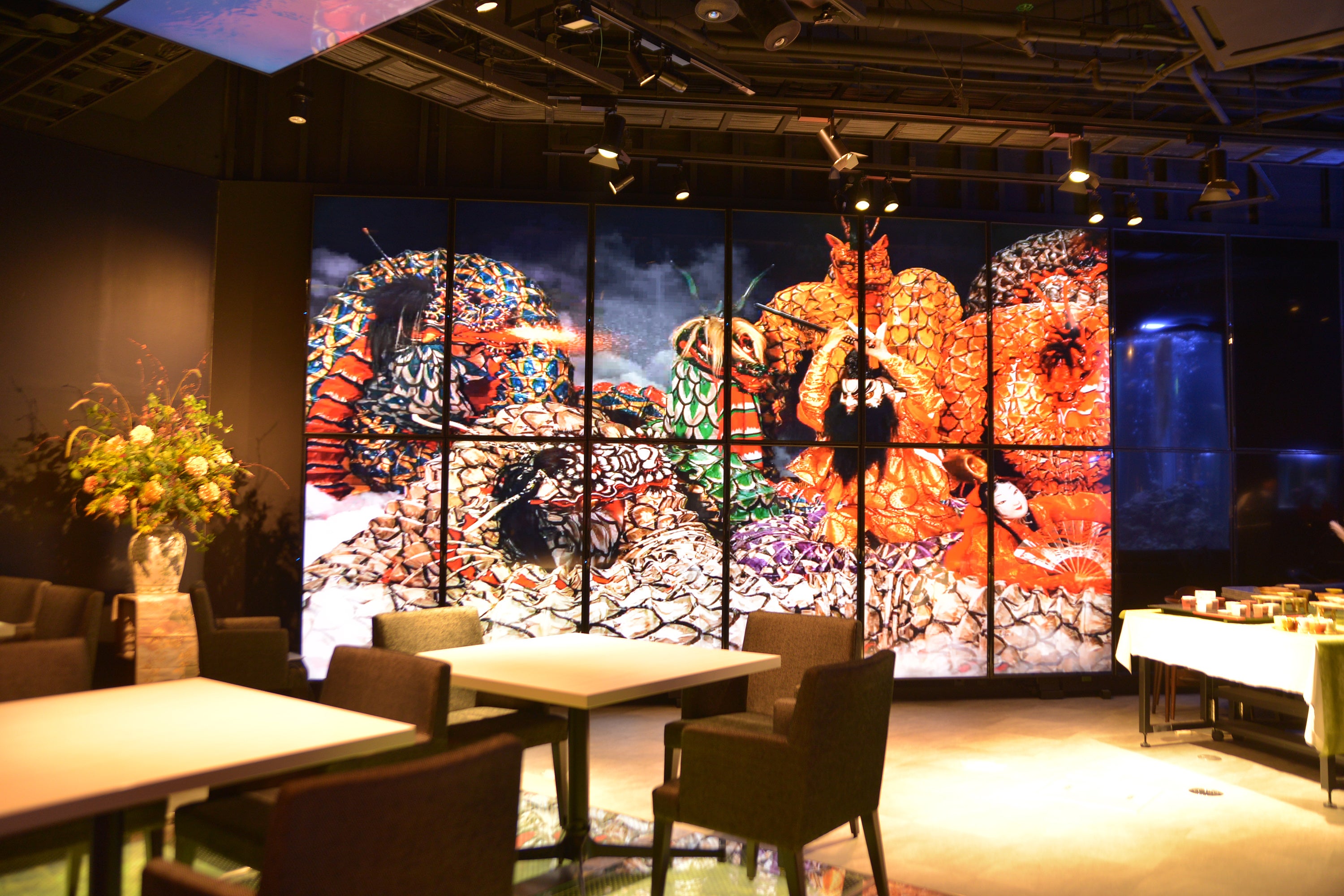 メインホールの 360°を取り囲む大迫力の 200 台モニター映像が季節や用途に合わせて 様々に変化し、新しい感覚を体験できるのが魅力、映像を料理と共に五感で楽しめる新たな 日本料理の世界へとお招き致します。30 年間ご愛顧頂いた「築地 竹若」が 2019 年 7 月に リニューアルして誕生いたしました。
