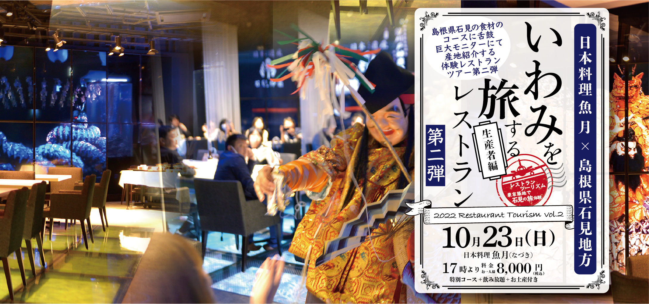 昨年 11 月に開催してご好評頂きました「いわみを旅するレストラン」は 日本料理 魚月(なづき)の店内に設置された客席を 360°C囲む巨大モニターに映し出された島根県石見地方の映像と一緒に現地の食材をふんだんに使用したこの日だけの特別コースお楽しみ頂き、東京に居ながら「食の旅体験」を出来るイベントになります。