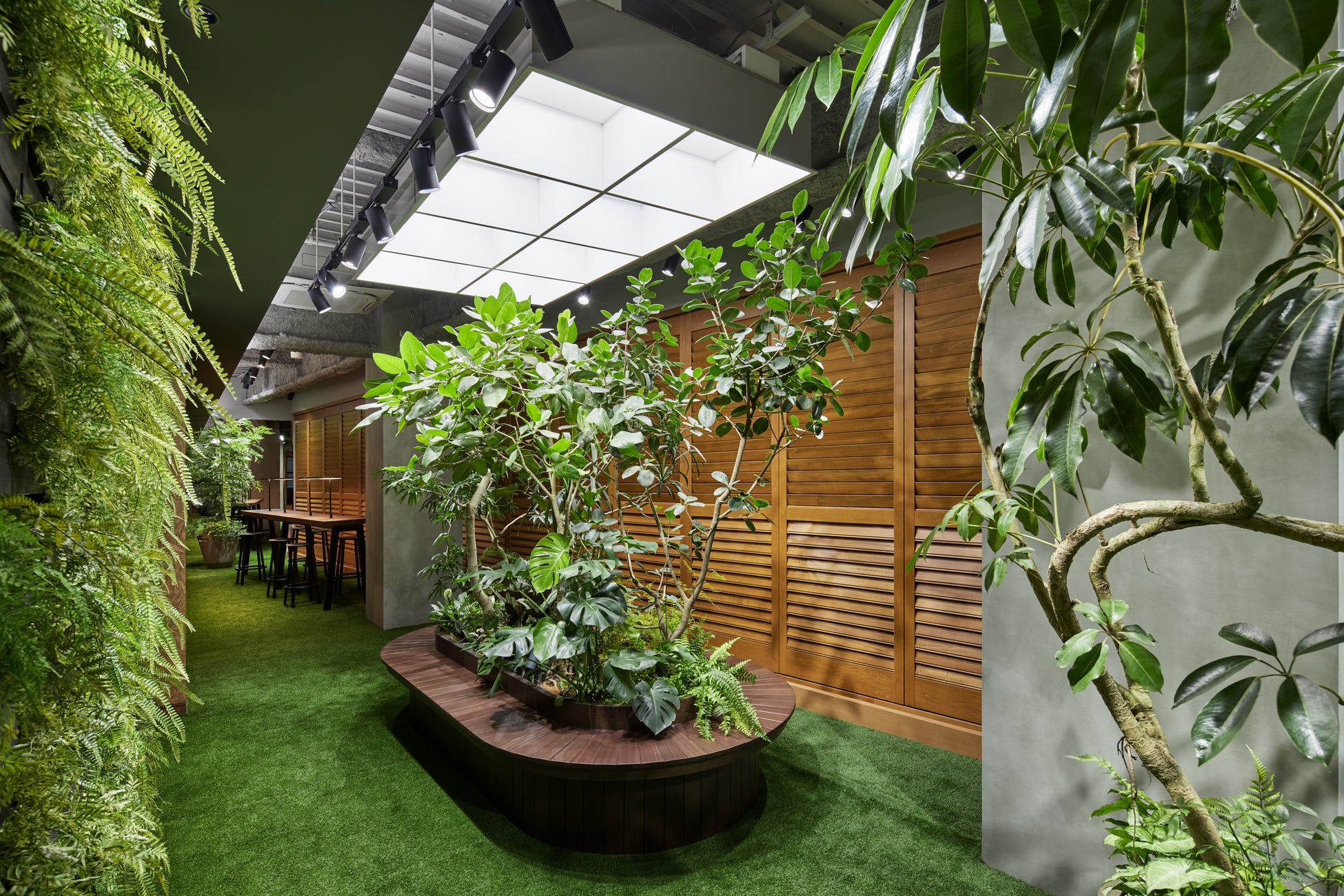 バイオフィリックデザインと自然光の再現に拘ったアウトドアリラックスゾーン。