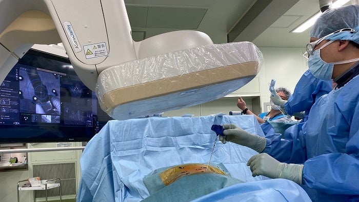 ひとつの部屋で血管撮影装置と手術台が組み合わさったハイブリッド手術室は、2013年にTAVI(経カテーテル大動脈弁植込術)が保険適用されたことをきっかけに広まり、現在は全国で約300台稼働しています。近年では、稼働率の向上を目指して循環器以外の手術での使用が増え、中でも脊椎手術への活用が注目を集めています。