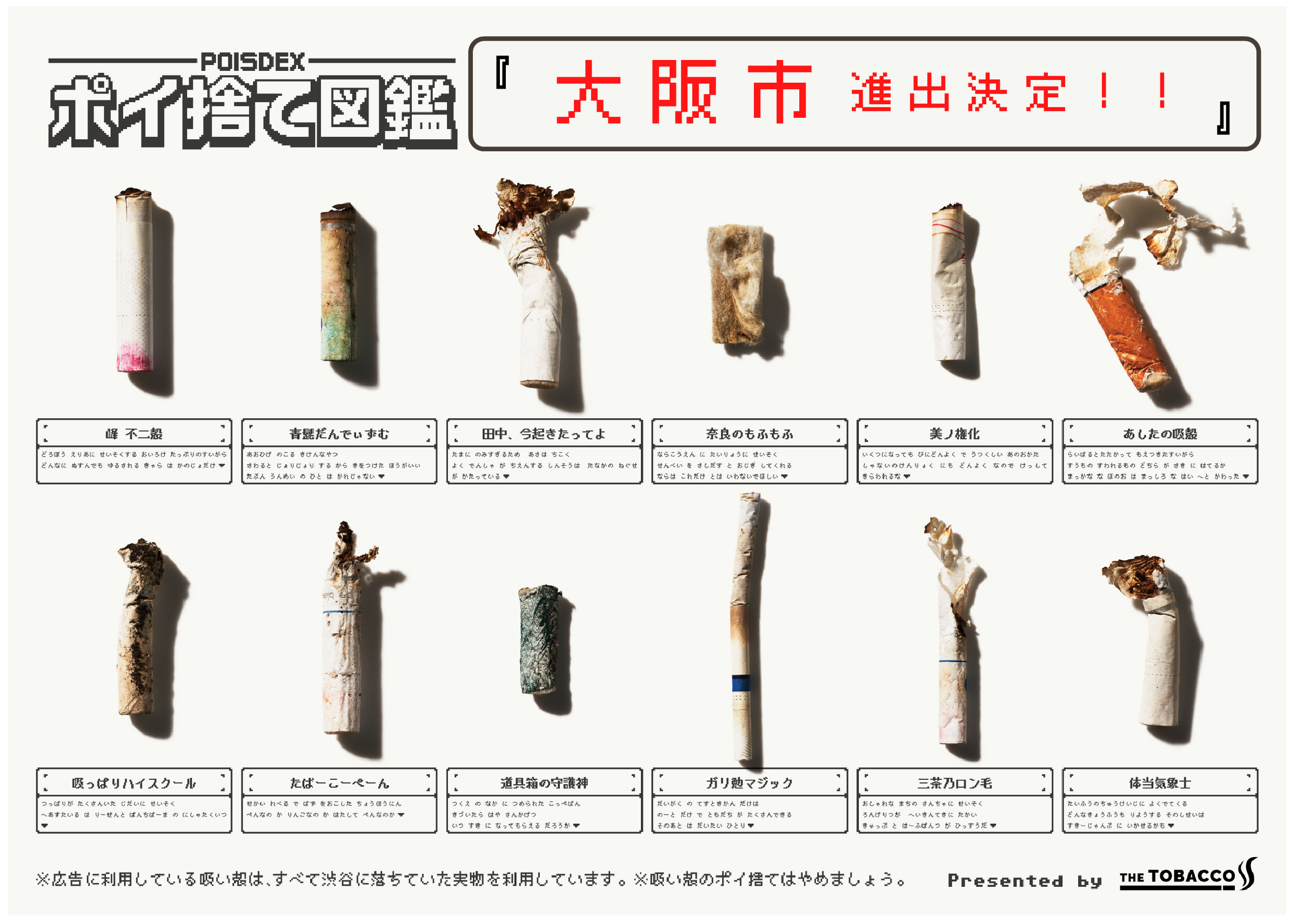 大阪市では、2025年の大阪・関西万博の開催に向けて 国際都市大阪にふさわしい美しいまちづくりを進めています。この度、大阪市内におけるたばこのポイ捨てや路上喫煙をなくしたいというポイ捨て図鑑の思いに大阪市が賛同したことから、大阪市の後援が決定しました。大阪市での取り組みとして、まずは現在東京都内12区限定で実施しているポイ捨て図鑑の投稿MAPを大阪市内全域に拡大します。