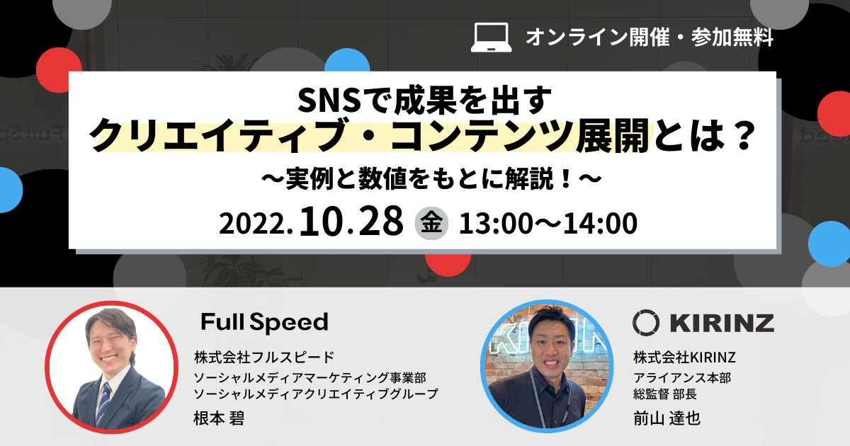 そこで今回は、インフルエンサー施策、キャスティング事業で企業のマーケティング活動を支援しているKIRINZ社とフルスピード社の2社共催で、企業のSNSにおけるクリエイティブ制作のポイントと、ライブなどを使用したインフルエンサーマーケティングの効果的な活用方法を、事例を交えながらご紹介させていただきます。