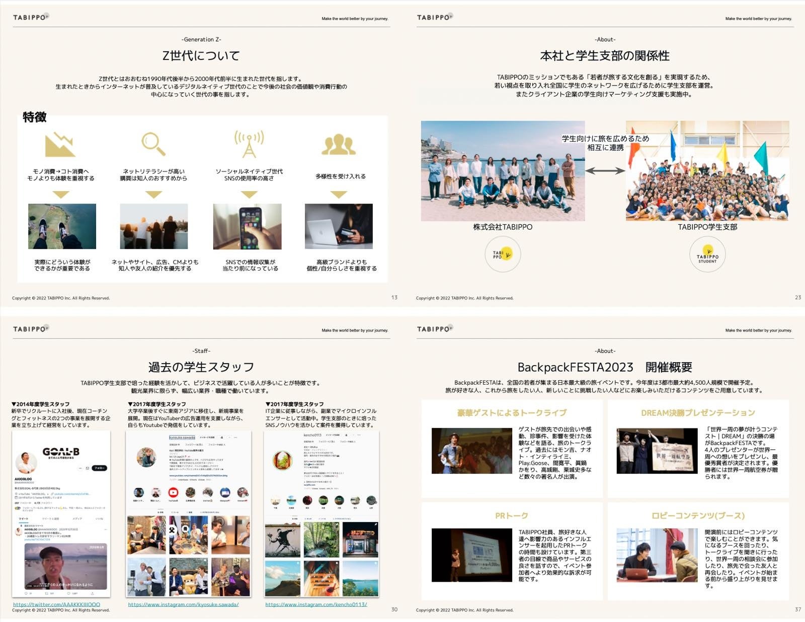 株式会社TABIPPOでは、全国にいる約400名の旅好き学生がスタッフとして活動をして、イベントの企画・運営やSNSの運用などを行う学生のコミュニティ「TABIPPO学生支部」を運営しています。TABIPPO学生支部では昨今のZ世代向けのマーケティング需要の高まりに合わせて、マーケティングプランの22-23年verを販売いたします。