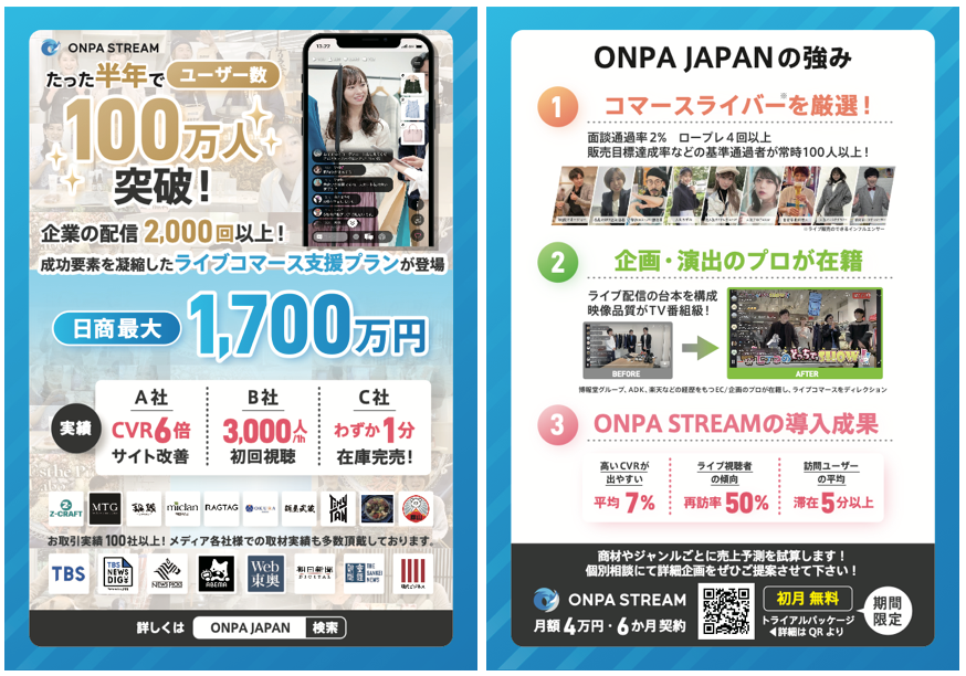 当社はBtoCのライブコマースに特化したプラットフォーム【ONPAMALL】の運営ならびに、自社サイトにHTMLタグを埋込むだけで簡単にライブコマースができるクラウドツール【ONPA STREAM】を提供しております。企業様の配信については累計2,000回以上のサポートをさせていただきました。