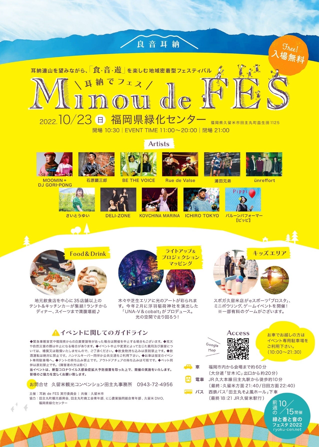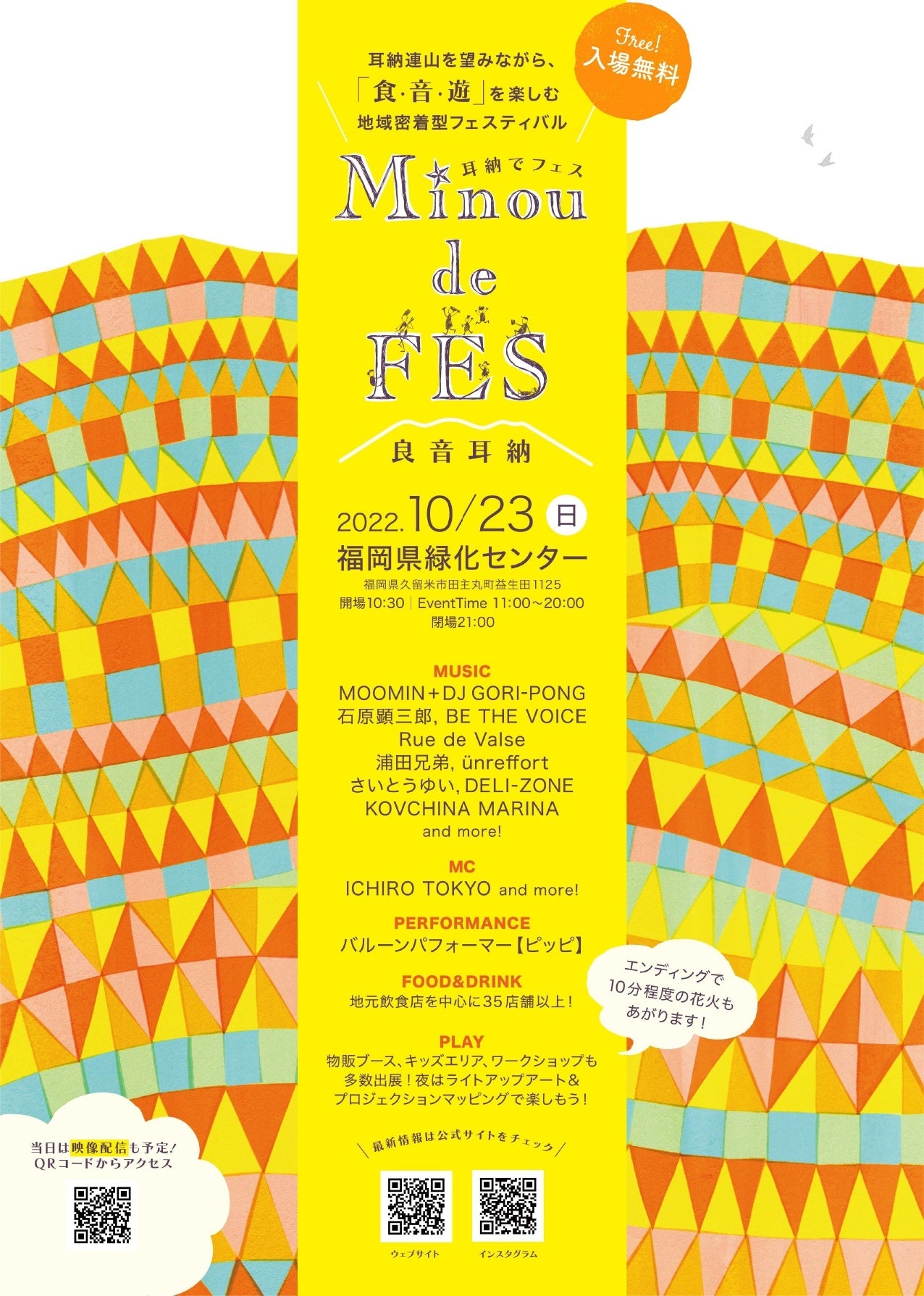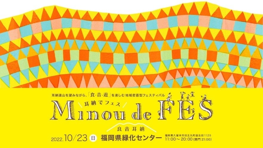 耳納北麓で、地域密着型の「耳納 deFES (みのう デ・フェス)」を初めて開催します。旧田主丸町時代から35回開催してきた「田主丸耳納の市」の後継イベントとして内容を一新しました。地元出身アーティストによるライブをはじめ、ライトアップアートやプロジェクションマッピング、地域の食を集めた飲食ブースなど。フィナーレには花火も打ち上げます。