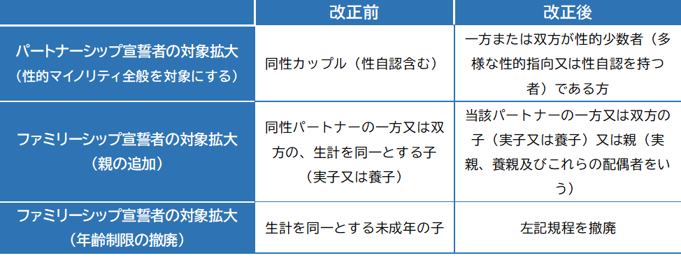 パートナー宣誓者の条件緩和、従来ファミリーシップ宣誓の対象であった「子」に加え「親」も含めるなどの改正を行いました。
