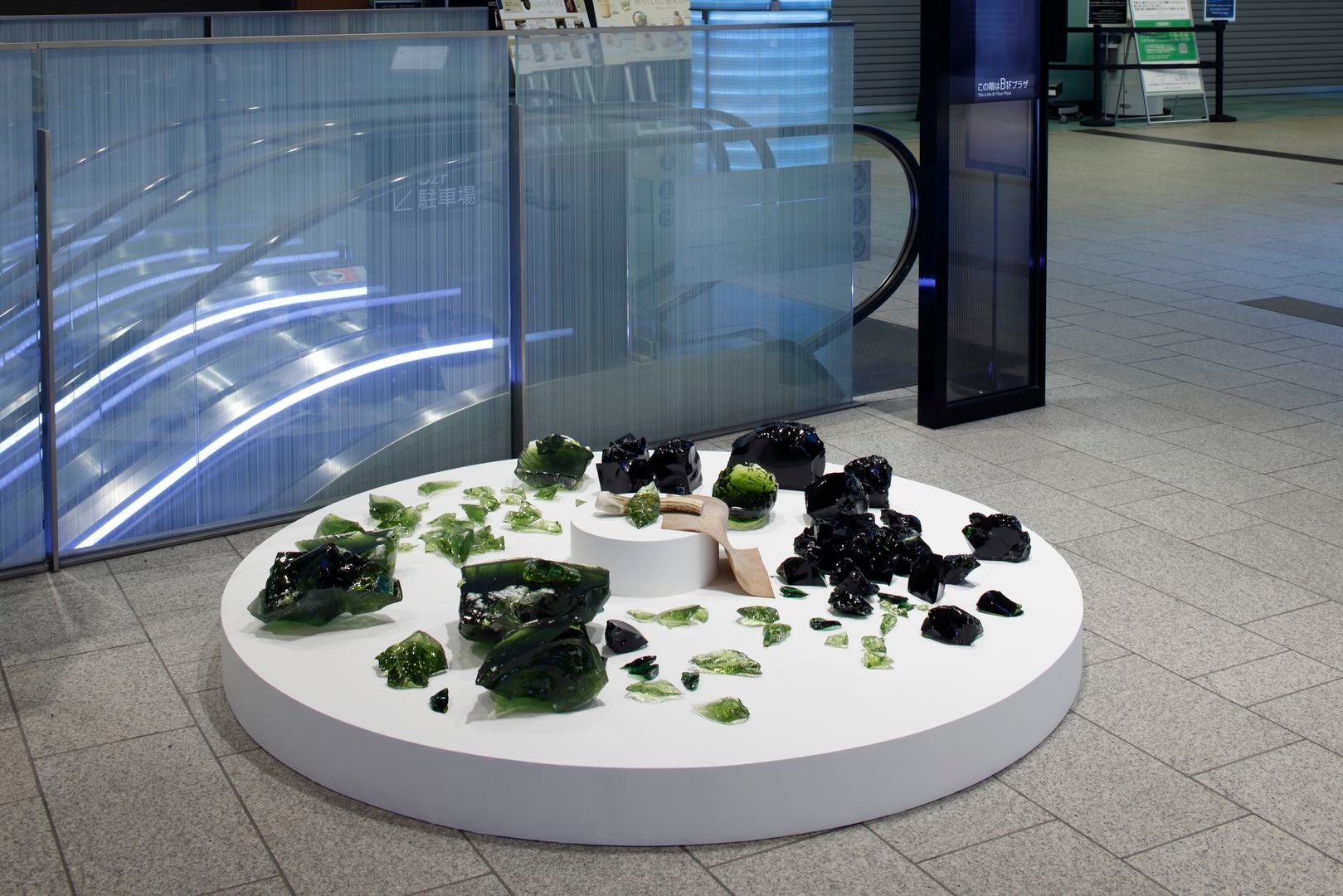 様々な土地の黒曜石を砕き、溶かし、混ぜ合わせ、人工的に塊を生成する。本作は、展示会場で作家が制作した石器と、そこで生じた破片を展示する。黒曜石は産地の歴史を保存した記録媒体と言える存在であり、それを合わせることは土地の記憶を共有させる行為である。石器作りという目的により、軌跡は記憶を保持したまま分散する。東京ミッドタウンという場の構造、そこで生まれる人々の営みからこの作品案が生まれた。