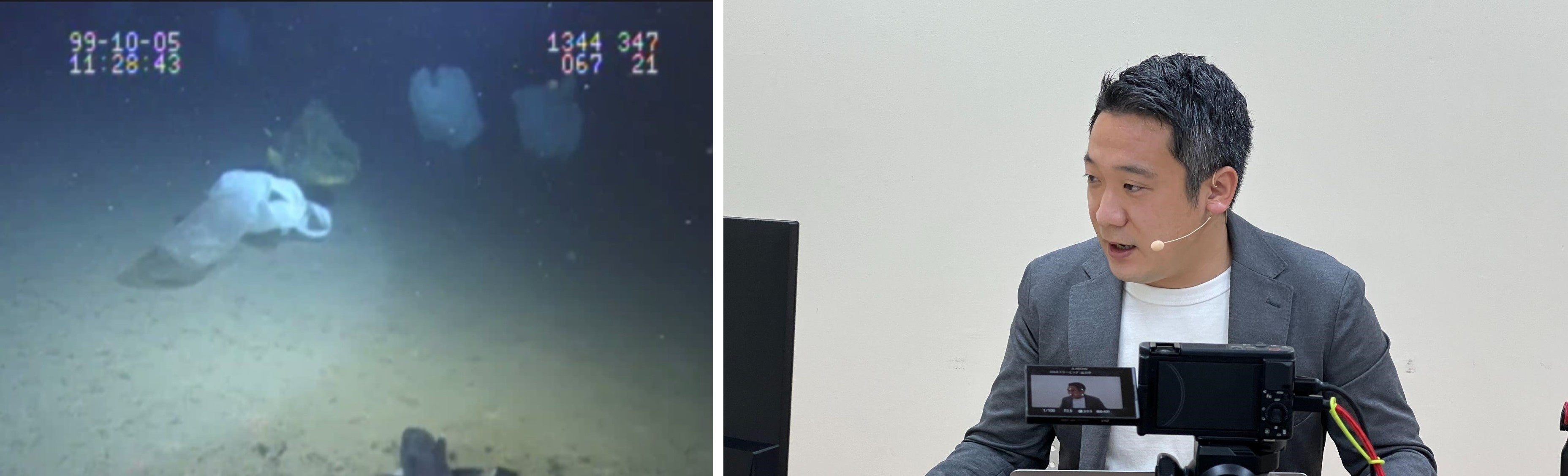 午前中に実施したSDGs講演会(オンライン)では、海洋研究開発機構・JAMSTEC 副主任研究員 磯部紀之先生によるお話でした。有人潜水調査船「しんかい6500」が深海に潜っていく様子や海底の様子など、実際の映像で紹介していただきました。映像の中には深海生物だけではなく、プラスチックごみがはっきりと映りこんでいたことに驚きました。大量に生産されたプラスチックは、正しく処理されなかったものが海へ流出し、そのうち99%は行方不明になっています。この海洋プラスチックごみ問題を解決するために、磯部先生は調査をして、海のものを使った「海にやさしい素材」の研究を進めています。未来を支える素材を消費者である私たちが購入することで、大切な海を守ることにつながるのだと学ぶことができました。