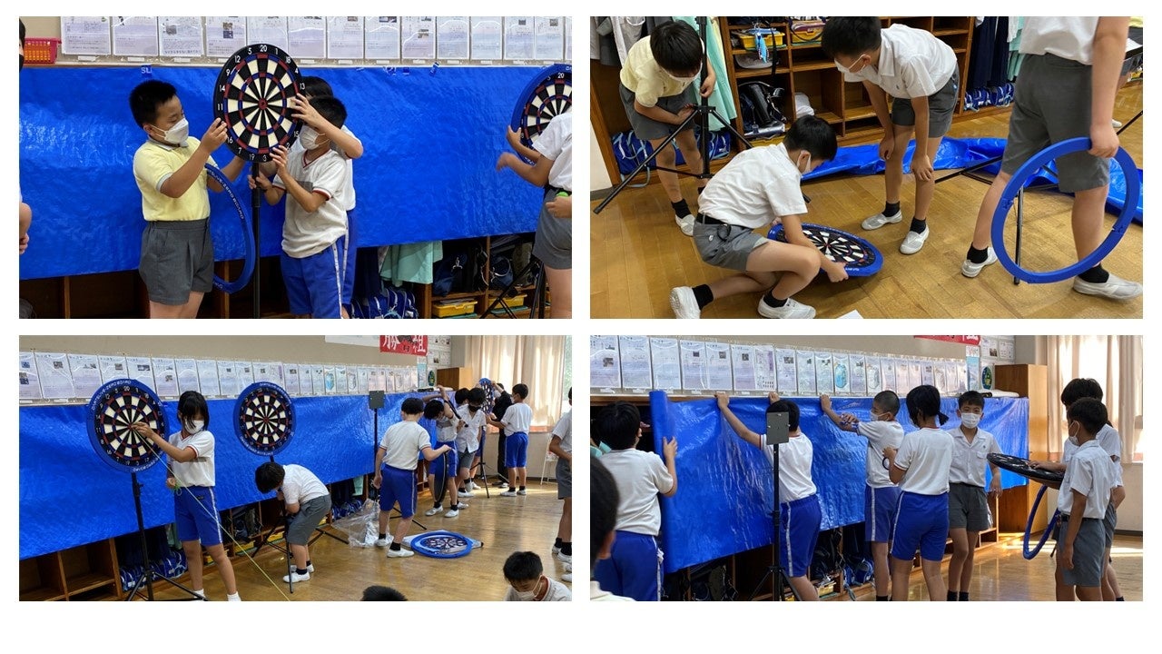 ダーツクラブが新設されたのは2022年4月、希望者22名で活動を開始しました。クラブ時間になると、児童が教室後方のロッカーにブルーシートを装着。これは投げたダーツの矢でロッカー内の荷物を傷つけないようにするためと、矢の紛失防止のためです。家庭用ダーツボードをポールスタンドに設置した後は、ボード中心からの距離を計測し、スローライン(投げるポジション)を決定。4月の活動開始から半年が経過し、児童による準備作業もスムーズに行われています。