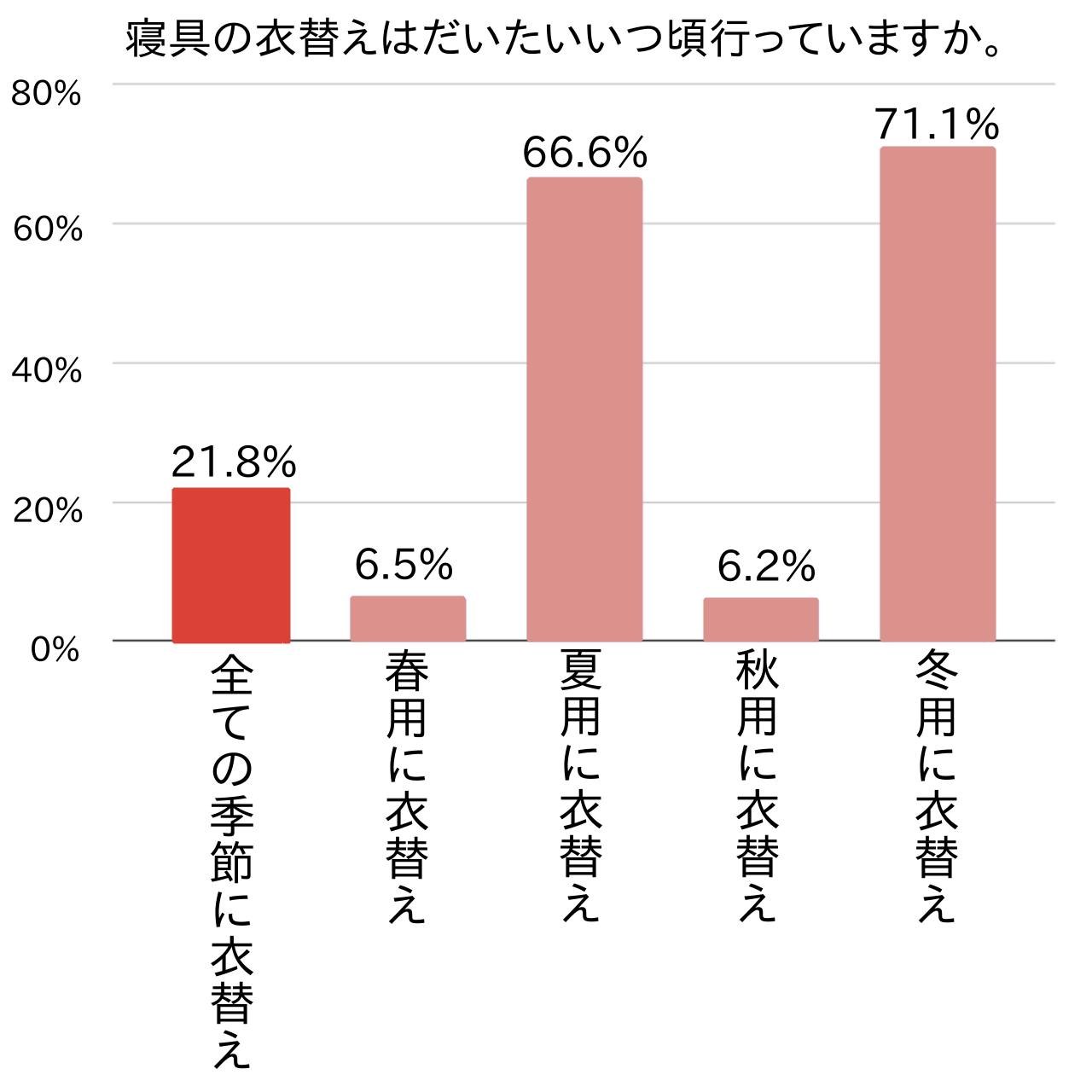年数回寝具の衣替えをする方のうち、特に多かったのが冬用に衣替え(71.1%)と夏用に衣替え(66.6%)でした。