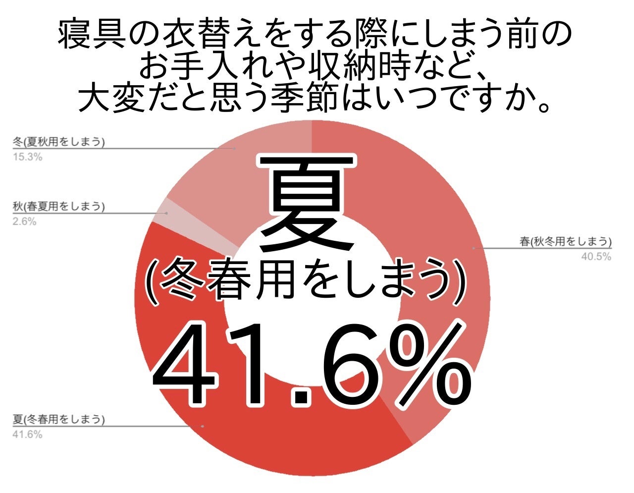 アンケートでは、冬春の寝具を収納し夏の寝具を出してくる夏の衣替えが大変と答えた方が最も多く、41.6%でした。