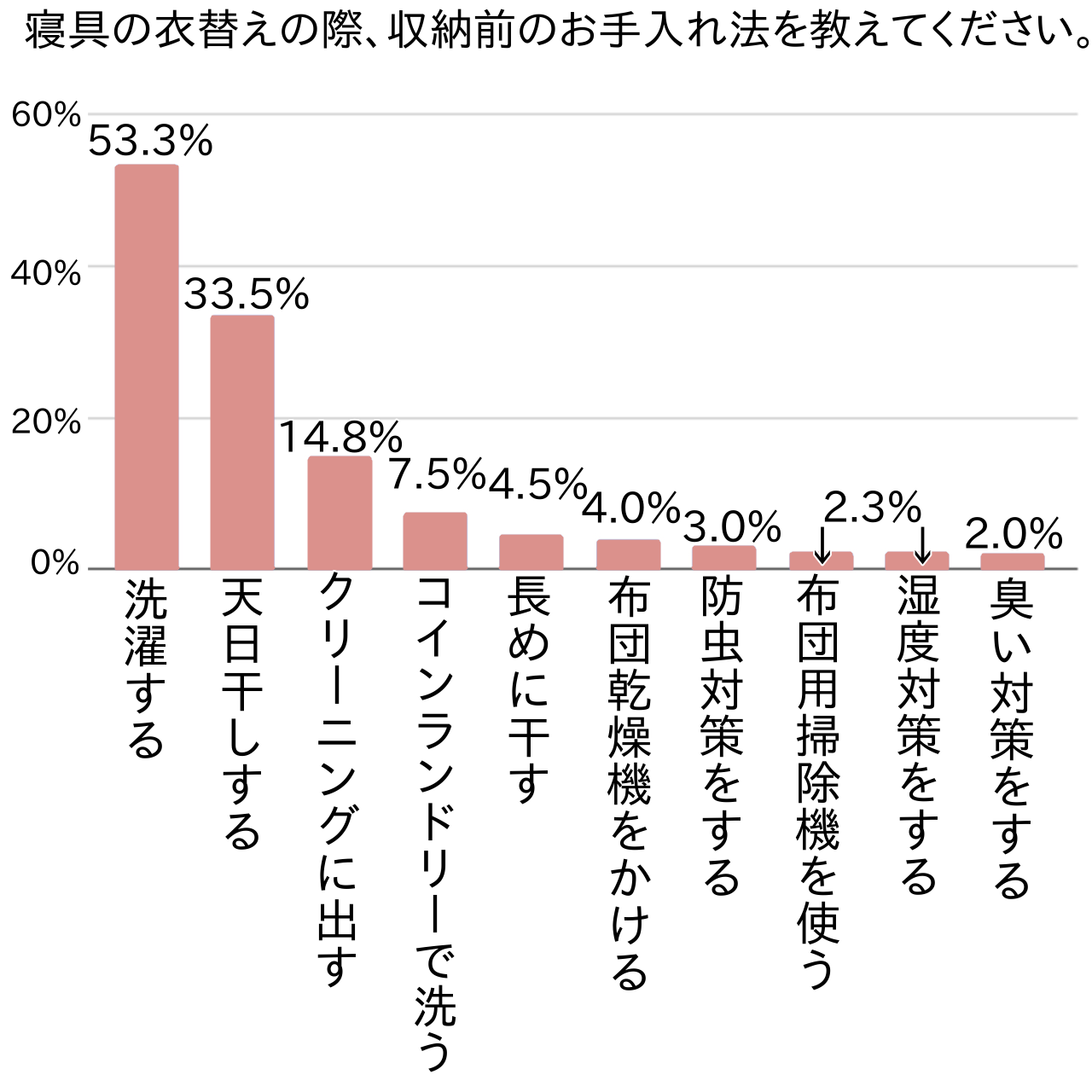 洗濯できるものは洗った上で、洗濯できない寝具の場合は第2位の「天日干しする(33.5%)」という流れが多数派でした。