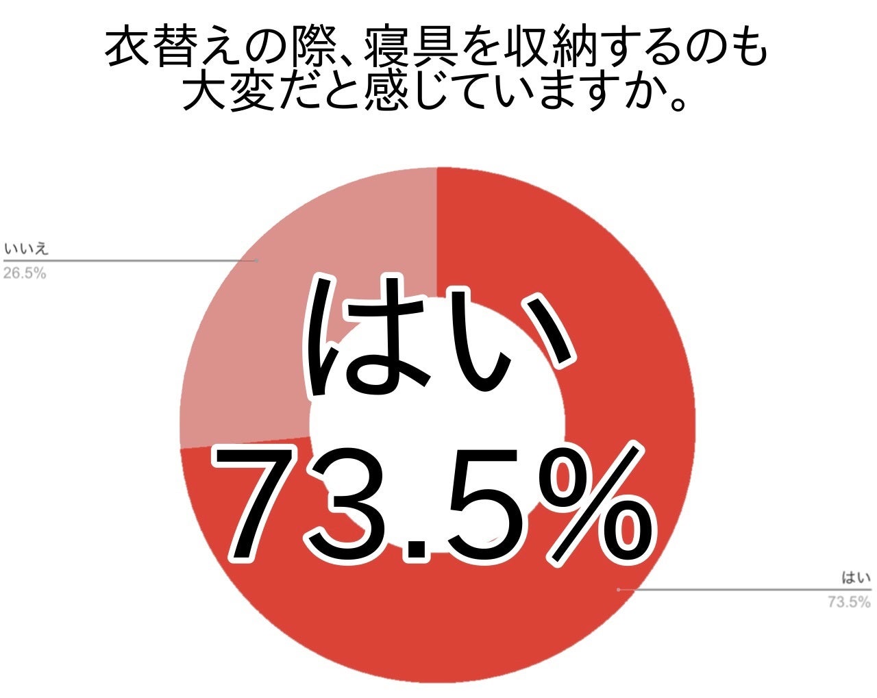 寝具の衣替え時に寝具を収納することが大変だと感じている方は73.5%でした。4人中3人程度が大変と感じており、特に重みのある冬物の厚手布団の収納作業が重労働かつ場所を取るので大変という意見が頻繁に見られました。