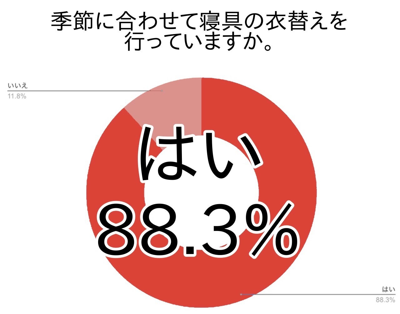 季節に合わせて寝具の衣替えを実施していると答えた方は88.3%を占めました。布団を使う方・ベッドを使う方を合算したアンケート結果ですが、約9割という高い割合です。