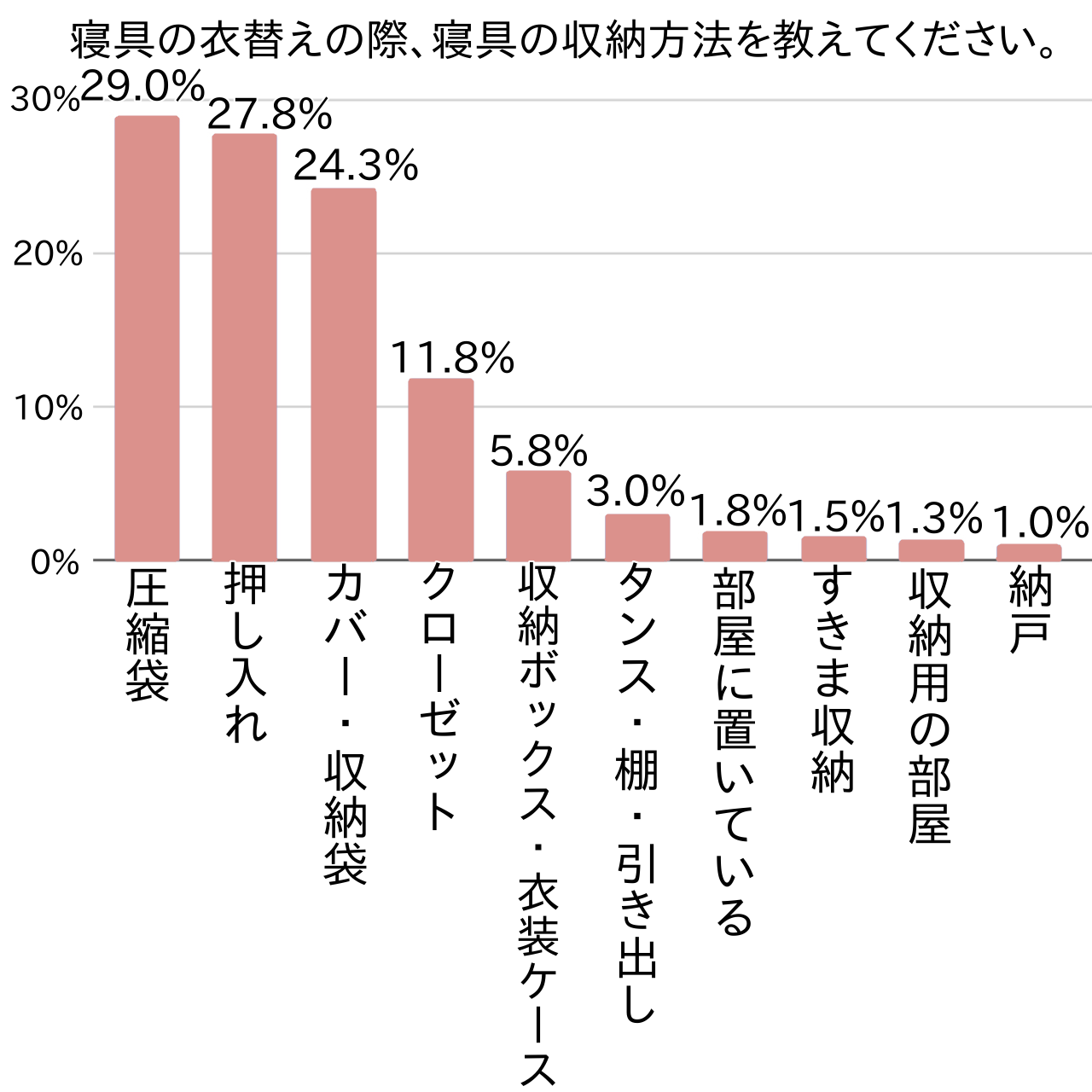 収納方法として最も多く挙がったキーワードは「圧縮袋(29.0%)」でした。特にかさばる冬物の厚手寝具は圧縮しないと置くスペースがないというケースが多いようです。