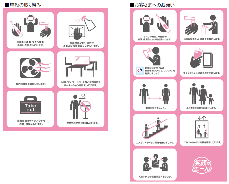 三井不動産グループが運営する商業施設では、新型コロナウイルス感染拡大防止のため下記をはじめとした様々な取り組みを実施しております。