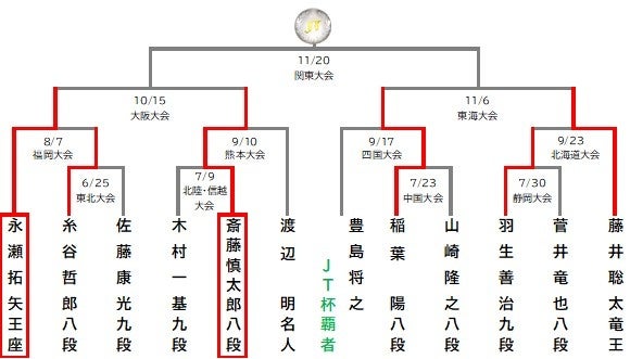 両者の対戦成績は、永瀬王座の6勝3敗。戦型は、出だしが矢倉模様の将棋が4局と最も多く、次いで角換わり腰掛け銀、角換わり早繰り銀、相掛かりが各2局となっている。 (千日手局一局を含む)過去の戦型から相居飛車はほぼ確実と思われるが、その中でどの戦型になるのかは全く予想ができない。いずれにしても斎藤八段が先攻を目指し、永瀬王座がそれをカウンターで迎え撃つという展開になるのではないかと推測される。両者は2020年第41回「JT杯」で対局があり、その際は永瀬王座が勝っている。斎藤八段は、二回戦で今年の名人戦で苦杯を喫した渡辺明名人に勝利し勢いに乗る。永瀬王座が再び壁になるのか、斎藤八段がリベンジするのか、お互い初優勝を目指す上で負けられない一戦。学年は一つ違うが奨励会同期の二人、東西で切磋琢磨してきた実力者による準決勝第一局は大激戦必至である。