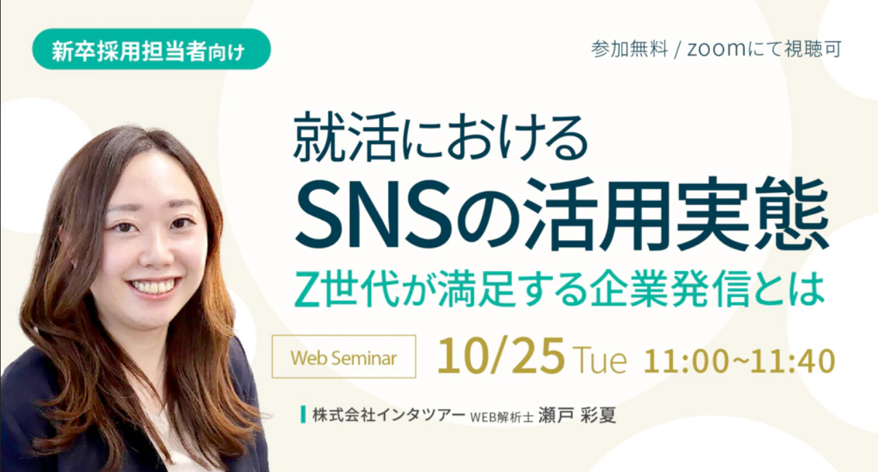 新卒採用向けのリーレション採用プラットフォームを提供する(株)インタツアー(代表:作馬 誠大、本社:東京都港区浜松町)は、2022年10月25日(火)に、新卒採用担当者向けオンラインセミナー『就活におけるSNSの活用実態~Z世代が満足する企業発信とは~』を開催いたします。