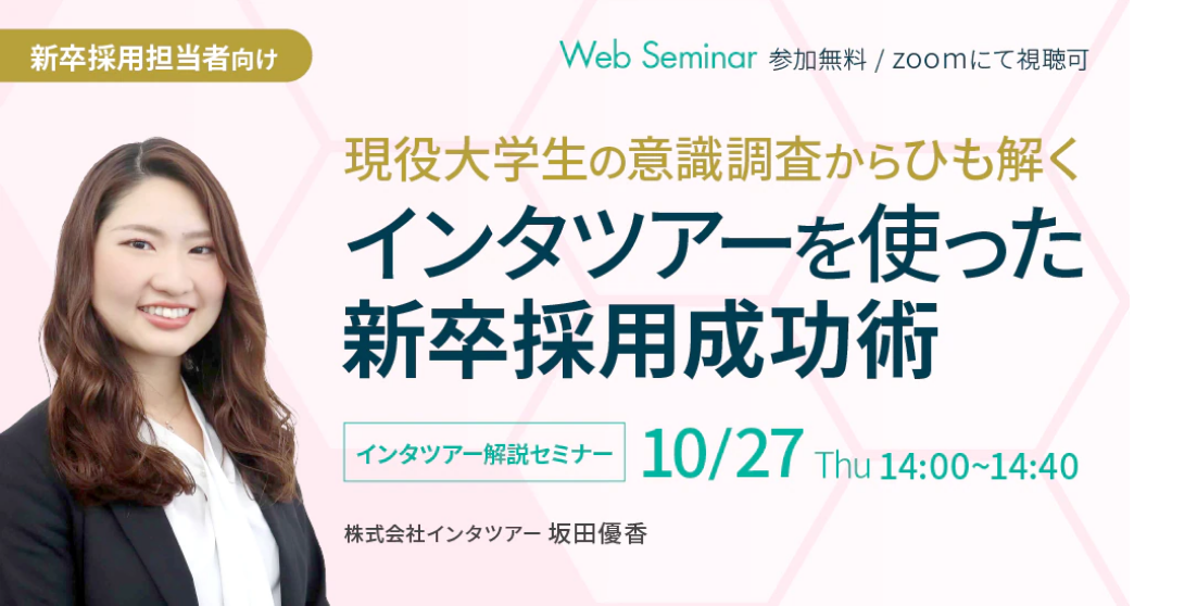 新卒採用向けのリーレション採用プラットフォームを提供する(株)インタツアー(代表:作馬 誠大、本社:東京都港区浜松町)は、2022年10月27日(木)に、新卒採用担当者向けオンラインセミナー『現役大学生の意識調査からひも解く インタツアーを使った新卒採用成功術』を開催いたします。