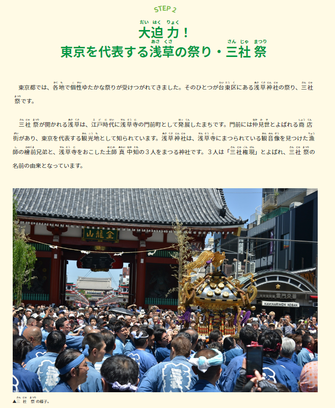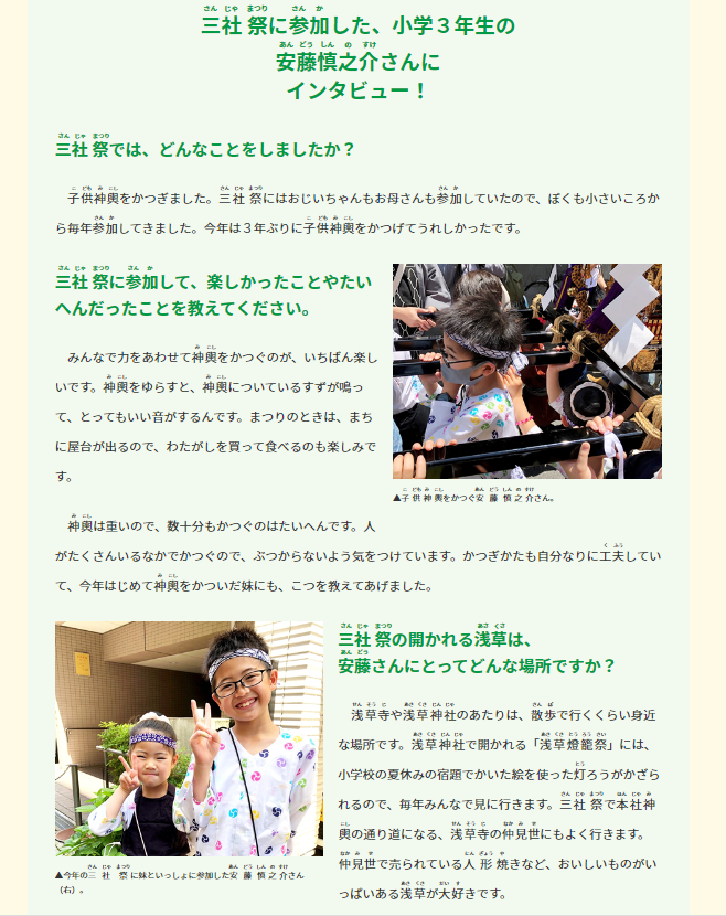 主な読者層にあわせ、今年の浅草 三社祭に参加した小学生のインタビューも掲載しています。ぜひご覧ください。
