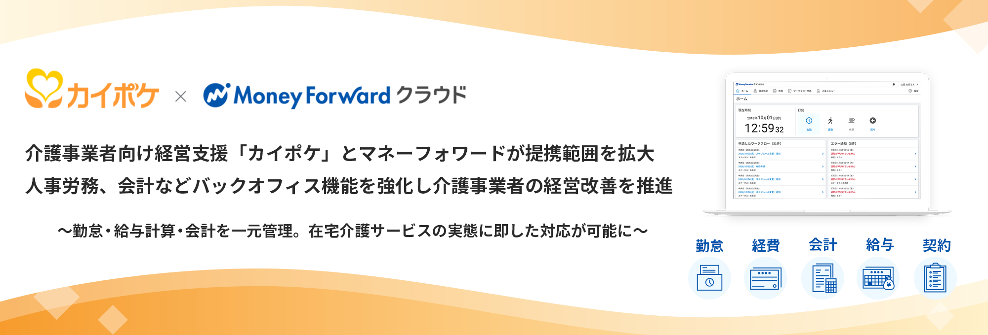 この度、変化するニーズにタイムリーに対応し、適切なバックオフィス機能を提供するため、マネーフォワードとエス・エム・エスは、2014年からの従来の業務提携範囲を拡大しました。会計サービスに加えて、人事労務や電子契約サービスを含み 、勤怠管理、給与計算、電子契約などにも対応した「カイポケ会計・労務 by Money Forward」の提供を開始します。これにより『カイポケ』会員は『マネーフォワード クラウド』の「ビジネスプラン基本料金」を支払うことなく、『マネーフォワード クラウド』の各サービスを利用することが可能となります※4。