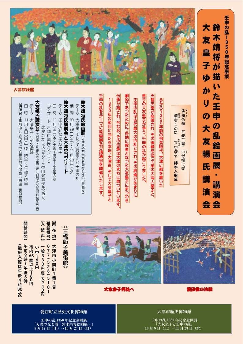 今年が壬申の乱と大友皇子の最期から1350年の節目に当たることから、これを記念して、日本画家の鈴木靖将氏による「鈴木靖将が描いた壬申の乱絵画展」を開催します。