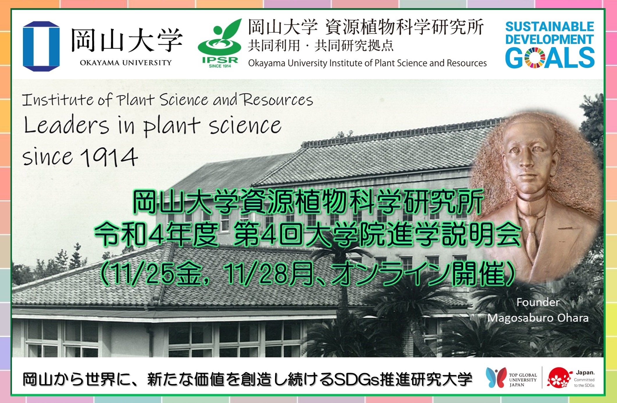 国立大学法人岡山大学(本部:岡山市北区、学長:槇野博史)資源植物科学研究所(倉敷市)では、大学院進学を検討されている皆様を対象に、大学院説明会を2022年11月25日(金)と11月28日(月)にオンラインで開催します。