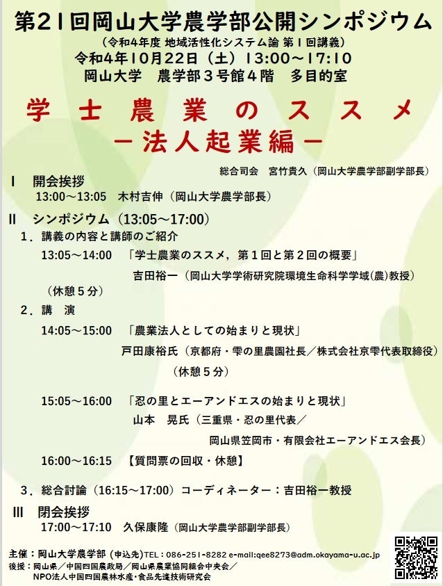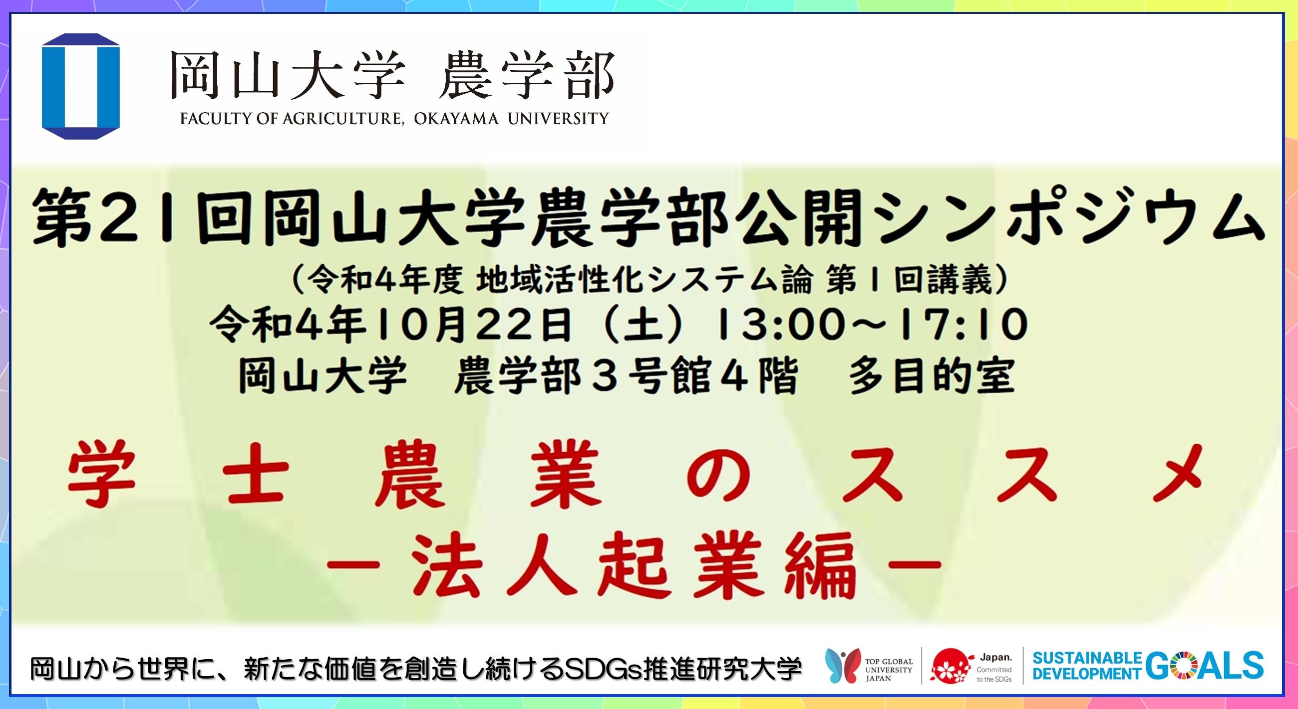 国立大学法人岡山大学(本部:岡山市北区、学長:槇野博史)農学部では、令和4年度「地域活性化システム論」を開催いたします。第1回目は「岡山大学ホームカミングデイ2022」と同日開催となる2022年10月22日(土)に「学士農業のススメ-法人起業編-」と題して開催します。