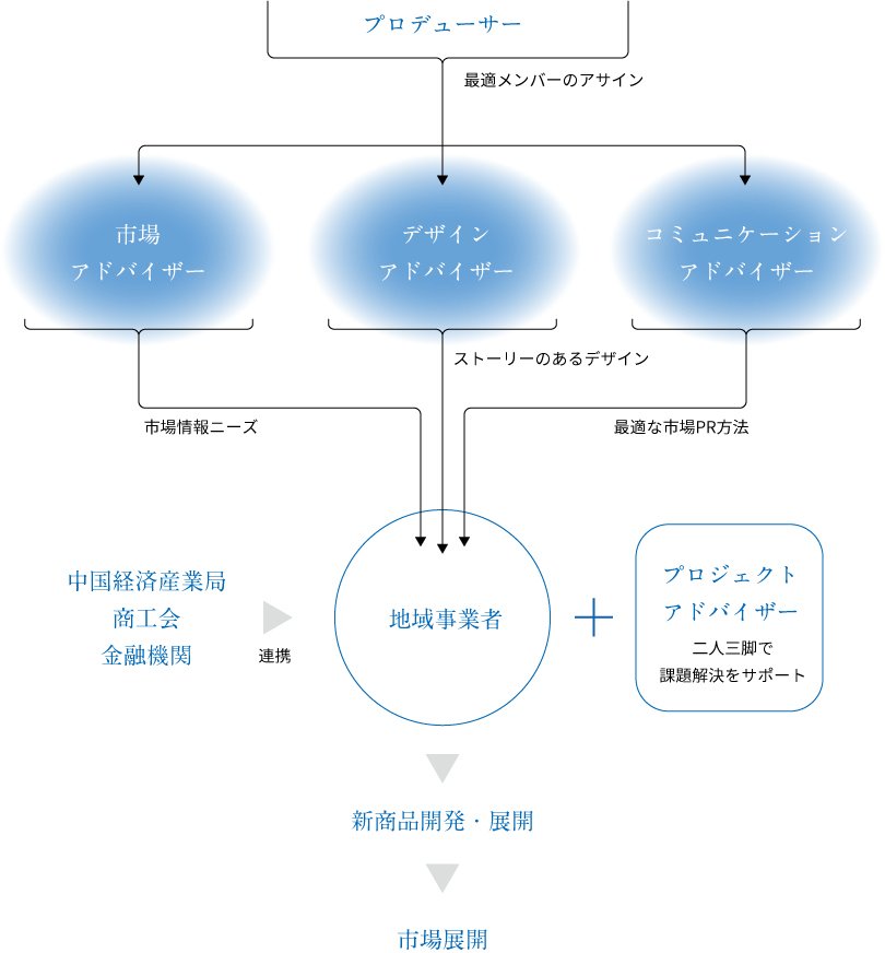 この専門家に加え、広島・山口で活躍する地域プロデューサーを「プロジェクトアドバイザー」として商品開発を二人三脚でサポートし、売れる商品を生みだします。