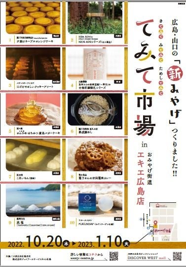 このたび、当プロジェクトで開発した新商品をおみやげ街道エキエ広島店にて、特設ブースを設置し、期間限定販売をします。さらにJR西日本地域産品オンラインショップ「DISCOVER WEST mall(ディスカバーウエストモール)」でも特設ページを設定し販売します。