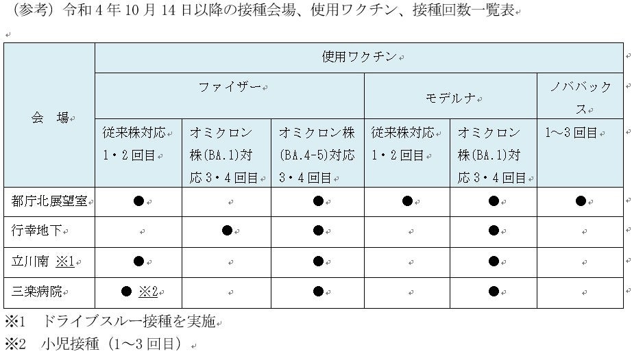 オミクロン株(BA.1)対応モデルナ社製ワクチンによる接種は、全4会場において継続して実施しますが、オミクロン株(BA.1)対応ファイザー社製ワクチンによる接種は、東京都行幸地下ワクチン接種センターに集約して実施し、他3会場では扱いませんのでご留意ください。