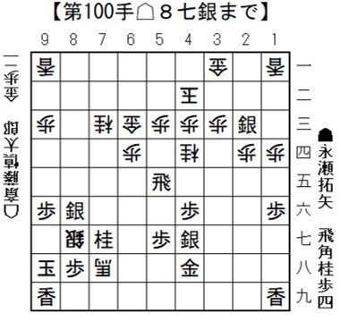 ▲8九歩    △8八歩成  ▲同 歩    △8七銀  まで100手で後手の勝ち