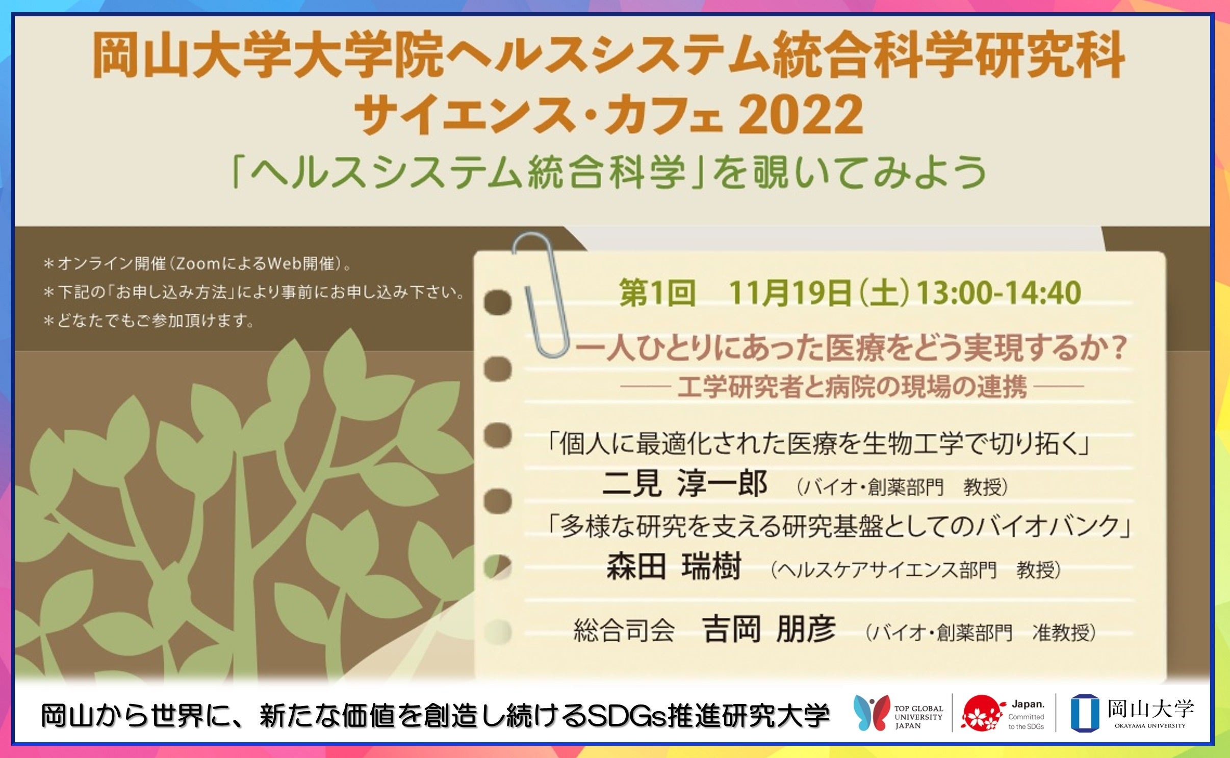 国立大学法人岡山大学(本部:岡山市北区、学長:槇野博史)の大学院ヘルスシステム統合科学研究科では、”「ヘルスシステム統合科学」を覗いてみよう”をテーマに2回のサイエンス・カフェをオンライン(zoom)で開催します。