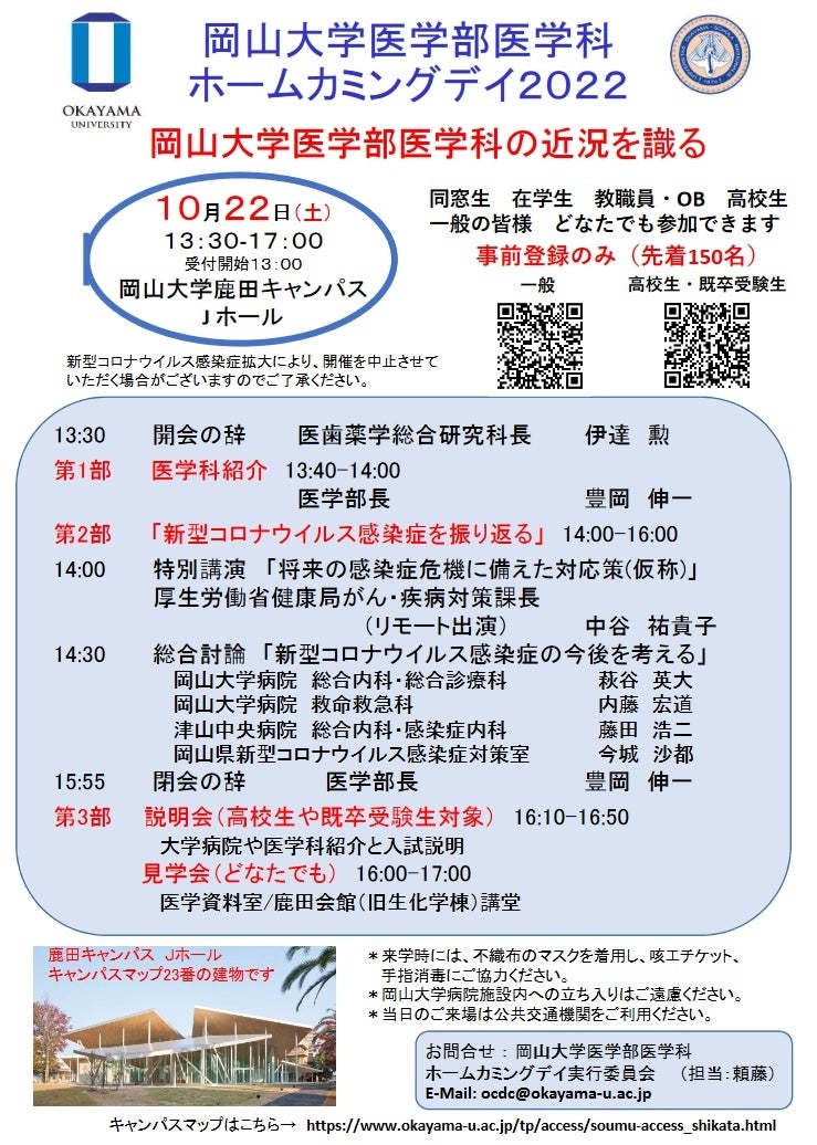 国立大学法人岡山大学(本部:岡山市北区、学長:槇野博史)の医学部医学科では、「岡山大学医学部医学科ホームカミングデイ2022」を2022年10月22日(土)に岡山大学鹿田キャンパスJホール(岡山市北区)で開催いたします。会では、合わせて高校生や既卒受験生対象の説明会なども開催します。