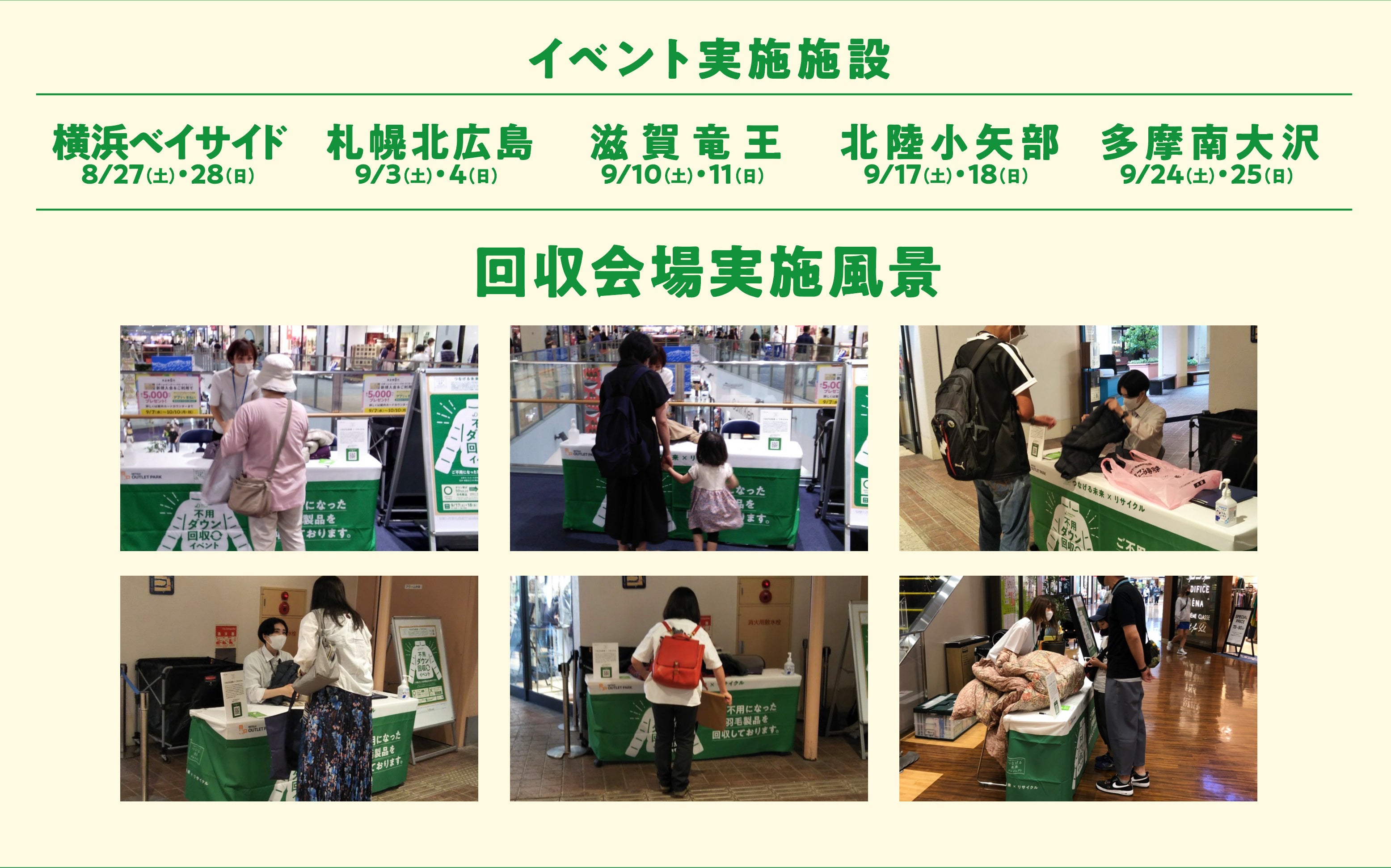 2022年8月27日(土)~9月25日(日)の期間(土日限定)、三井アウトレットパーク5施設(札幌北広島・多摩南大沢・横浜ベイサイド・北陸小矢部・滋賀竜王)で不用ダウン回収イベントを実施しました。