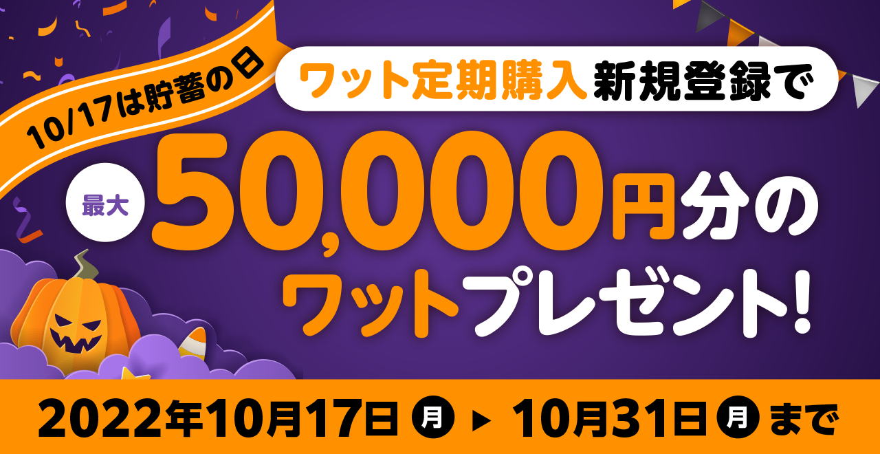 期間中、「ワット定期購入」に新規登録いただいたお客様には最大50,000円分のワットをプレゼントしますので、普段よりさらにおトクにはじめていただけます。